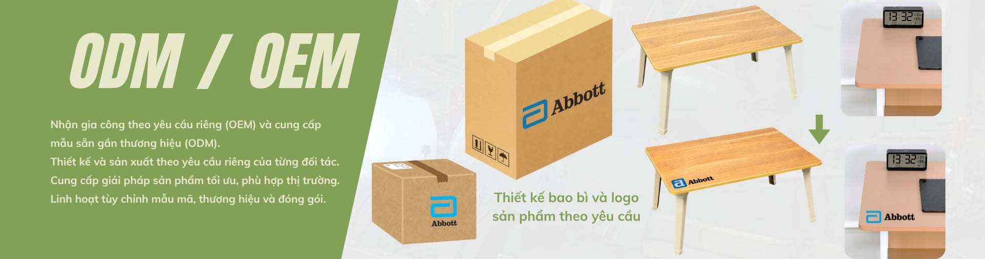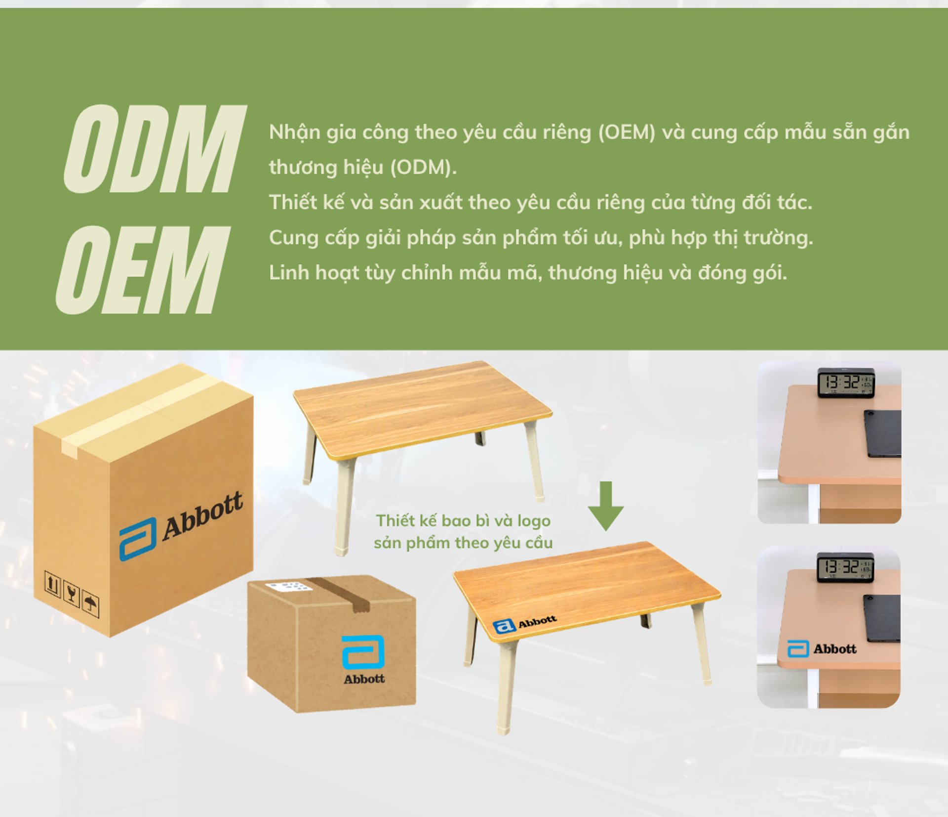 Đa dạng mẫu mã, kích thước, sản xuất ổn định 200 chiếc/ngày. Mặt bàn bằng gỗ, nhựa hoặc sắt; chân sắt hoặc inox 304, đảm bảo độ bền cao. Nhận gia công ODM/OEM với số lượng tối thiểu 1.000 sản phẩm.